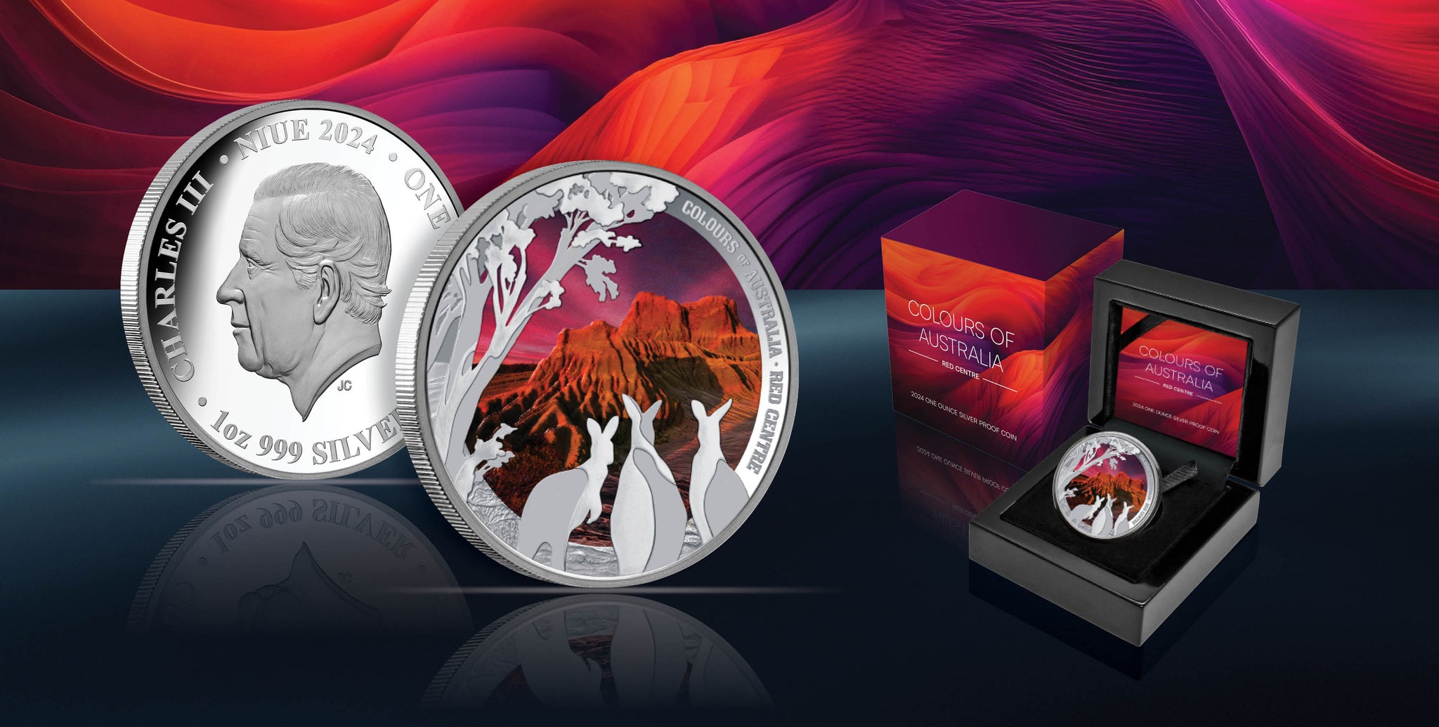Begin a fiery adventure Down Under with the first silver coin in the Colours of Australia series! We are proud to announce the 2024 $1 Red Centre 1oz Silver Proof Coin – a spectacular celebration of the red heart and soul of Australia!